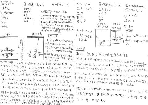 ★はやい四人組チーム フラッグフット ふ・ゆ 今日、ファイヤードラゴンチームに負けてしまいました。くやしかったです。 フラッグフットで学んだことは、まず相手をだます。次にさくせんを考えてチームが一つになった。昼休み、みんなでれんしゅうしたこと。相手のしあいを見て、べん強した。くせや、どっちに走るなどをした。 先生が、フラッグフットでわたしたちに言いたかったことは、わたしの考えでは、一人ではなく、みんなで頭を使って考えて欲しかったんだと思います。考えることで、べん強・スポーツなどでしょうらい役にたつと思います。先生が、言ったことをそのままじっこうするのではなく、自分たちで考えてじっこうすることにいみがあるのだとおもいます。 負けたけど、もう一度したいです。 わたしがフラフトで学んだこと く・さ わたしは初めフラフトを始めた時、何、このボールと思いました。そして、先生からフラフトというボール遊びを教えてもらって、さいしょ先生がせつめいをした時、わたしは意味がよく分かりませんでした。 そして、チームはどうやって決めたのか忘れてしまったけど、ゆうかちゃんとあやちゃんとこうりゅう君とわたしで名前を付けました。それは、はやい四人組と決めても、先生は「えー」といい、「おそい4人組」 とか言っていたけど、何回かして、一回しか負けたことがなくて、あとはぜんぶ勝ちました。 そして、イエスとノーとかそれにダンスがついて、先生やみんなからダンスチームといわれ、そしてマンツーマンや、ゾーンや、まあいろいろ教えてくれて、まわりがほとんどを強くなってきました。そして、だんだんと守りが良く、おもしろくなってきて、良かったです。 前、わたしたちはさいしょどこかのチームとやり合ってチームの守りが良くなくて、点が何点も入り、ちょっとうれしかったけど、守りが弱すぎると、点がどんどん入って、あまりつまんなくて、そして、次の日トーナメントを始めると思ったら、リーグ戦をはじめ、二対一でドラゴンと引き分けだったけど、先生が計算して、わたしたちのはやい四人組は三位でざんねんでした。 わたしたちの学んだ事 ふ・こぼくは、フラッグフットって、さいしょ何だろうと思いました。やっていくうちに分かってきました。それで、学んだ事は、だましさくせんができた時は、それがせいこうして、とってもうれしかったです。負けたりしたけど、みんながんばったからよかったです。 わたしがフラフトで学んだこと は・あ 今日で、フラッグフットがさいごです。はじめてやった時は、すごく楽しかったです。だんだんみんなのちえが出てきて、フラッグがとれなくなり、わたしたちもがんばってきました。だましたり、パスしたり、いじけたり、でも、それが今日でさいご。 わたしたちのチームは、こうりゅうくんがへびのようなうごきで、ゴールまで行って、あいてチームもびっくり。ときどきまけてしまうけど、昼休み、みんなでいろいろやって、いい考えが出たりし、こんどはかてそうなきがしたりして、こんどのしあいが楽しみになりました。そして、みんなで、けっしょうせんをして、ぜったいに勝つと思ったら、さくせん大しっぱい。あいてチームにやぶられ、十点入ってしまいました。これじゃあまずい。みんなせめていくけど、むりだった。八たい十一であいてチームが勝ってしまいました。ここまでいいチームだったのに。点数で数えたら、三位。 こんなけっかになるなんて、四人みんなショックでした。そして、ホワイトドラゴンが勝ち。わたしは、どうしてホワイトドラゴンに負けなきゃいけないの?というようなかんじでした。けど、今までよくがんばってきたチームワークなので、これだけはみんなにまけません。 ★教育実践ノート/その14〜わたしのブログより〜子どもを守る |