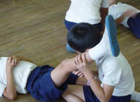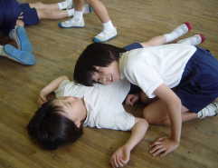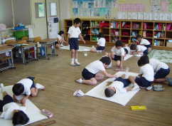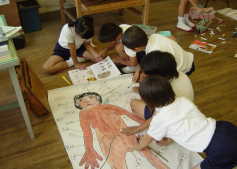| 総合では,「いのちの音を聞いてみよう」に続いて,「からだの地図」作りに取り組みました。四つのグループで一人ずつモデルを決めて,からだを写し取り,各部分の名称を書き込んで,等身大の「からだ地図」が完成しました。 わたしたちの「いのち」の宿る場所は,ほかならぬ一人ひとりの「からだ」の中です。今回のねらいは,そのからだの各部分の正しい名前を知ることによって,からだについての科学的で意識的な見方を育てるということでした。 まず,子どもたちは,横たわったモデルの子のからだの輪郭をなぞりながら,太くなっているところやくびれている所などを確認しました。性器の所をかくときは,恥ずかしがっているグループもありましたが,ちゃんとかきあげてくれました。 続いて,図書室から借りてきた図鑑を元に,各部分の名前の確認です。一つひとつの部分に名前がついているということは,からだ全体を漠然と捉えるのではなく,他と区別して,より細かく分析的に見つめることを可能にします。そのことで,例えば,足が痛い時には,ただ「足が痛い」と言う子どもではなく,「右足のかかとが痛い」と言えるような子になってほしいと思うのです。 それでは,二回に分けて,子どもたちの感想文をご紹介します。 ★HH YMちゃんのえがすごくむずかしいでした。かおのいろがへんになりました。 しろいのでけしたら,しろいあとがつきました。むずかしいし,たのしいでした。ふとももをかきわすれていて,おしえてくれてかきました。 ★KNわたしは,FMくんの体をかいていたとき,ふくらはぎやだいたいというところがあるって,しりませんでした。 わたしたちの体には,自分が知らないところがあるから,それだけたくさんだけど,どうやって名前を作ったのかなと思いました。 ★YM 体をかいてもらうとき,ちょっときんちょうしたけど,あとからだんだんなれてきて,楽しかったです。 色をぬるとき,かおだけいろがこゆくて,へんになったけど,じょうずにできたなあと思いました。 ★FA 体の地図をかいて,体のいろいろなことがわかりました。一つめは,バルバで,二つめは大たいとか,三つめは,むねで,四つめは,じょうわんで,五つめは,かたい,六つめは,ぜんわんとかいろんなことが,わかりました。 わかっていたこともあったけど,ちゃんと,ほんとうの言い方があると,わかりました。 いいべんきょうになったと思いました。 ★FAわたしは,はじめて体の地図をつくりました。わたしは,体の外がわをはじめて知りました。 くるぶしや,前わんや体のしゅるいをはじめてしりました。 また,体のことをいっぱいしってみたいと思いました。外がわも,もっと名前を知ってみたいなあと思いました。またやりたい。 ★KA いのちのべんきょうで,体をかいて,わたしは,うでとかわきとかしか知らなかったけど,むずかしい名前とかあって,みじかいことばでもむずかしくて,すごいなあと思いました。 わたしは,いちばんおなからへんがいっぱい名前があると思っていたけど,かおがいちばん名前が多かったから,すごいなあと思いました。 ★TR 体のことで本をしらべたら,しらなかったことがわかりました。でも,まだしらないものもあります。すごくかくのがむずかしかったです。 すねとか,はじめて知りました。大たいとかもはじめて知りました。手のこうというのもはじめて知りました。 いろいろわかったので,よかったです。 ★FM 体のこともいっぱいわかりました。 しらなかったくるぶしや,前わんとか,知らなかったのに体の絵をかくと,いっぱいわかりました。体の名もしらべてわかりました。えをうつすのもむずかしいでした。でも,じようずにできたと思います。留盛あかり 体の名前が,よくわからなかったけど,だいたいわかるようになったのでよかったです。 体をかくとき,むずかしかったです。わたしは,あやチーの口をかくときに,むずかしいなあと思いました。 ★HT 今までそう合の時間に,体の名前をかいてきました。分からなかった体の名前も,もうしらべてわかりました。でも,かいていないやつがあたので,書きました。 ★MA ぼくは,からだのおべんきょうをして,こんなのがあるんだなあとわかってきました。またかいてみたいなあと思いました。ちょっとわかってきました。 ★KRわたしは,はじめて人間の体の地図をかきました。そして,人間の体の地図をかいているとちゅう,少しきんちょうしていたけど,とてもおもしろいし,すごいなーと思いました。 わたしは,人間の体の中も,地図にしてかきたいなーと思いました。 ★FM ぼくは,大たいや,いろんなことを知りました。 ★TS きょう,体のちずができあがったのを見たら,ぼくの知らない名前ばかりありました。本でも調べたりしたら,すごくいっぱいありました。脳みそもありました。 ★KR 今日,体の表のようなのがかんせいして,分かったことは,男の体も女の体もほとんど同じなのです。 それと,くるぶしやすねのあるところが,分かりました。 もっともっとしらべたいです。 |