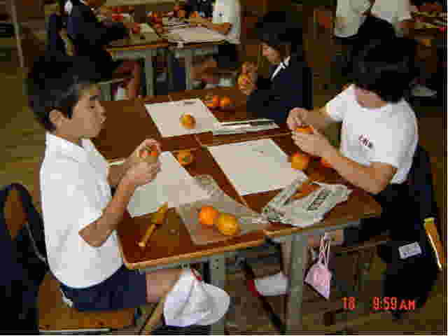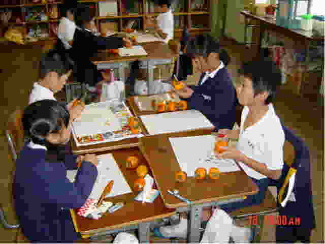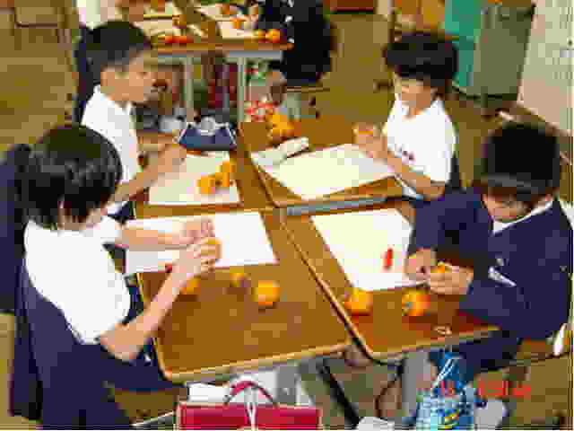 ■その1〜「しぶさ」を味わう(「天までとどけ」bU4) 月曜日は,佐多町に住んでおられる愛実さんのおばあちゃんから送って頂いたしぶ柿を使って,干し柿づくりに挑戦しました。自称「しぶい男」(?)の担任としましては,干し柿の甘さを味わわせる前に,ぜひあの独特な「しぶさ」を味わわせておきたいと考え,総合で「しぶさを味わう」という学習を実施しました。 「しぶ柿を食べたことがない人」と問うと,五・六人が手を挙げてくれました。「しめしめ,楽しいぞ…」とニヤニヤしながら,二個だけ皮をむき,十六人分に切って配りました。しぶ柿も,ぷーんといいにおいが漂います。ひょっとしたら,甘いかも…と揺さぶりながら,「さあ,いっきに食べるんだよ」と言うと,「エー,イヤだー」の声。既にしぶ柿を味わったことのある子どもたちでした。 それでも,食べてもらわなければ,今日の目的は果たせません。「うんにゃ,ちゃんと食べるのです」と,半強制的に(?)食べさせてあげました。ただ一人,「しぶさ」の恐怖に耐えられず,食べなかった子がいましたが…(誰でしょうね?)。 さて,子どもたちはどのように「しぶさ」を味わってくれたでしょうか。なかなか見事な表現が生まれてきましたよ。 ※※ しぶいって,砂が入ったみたい KA わたしは,しぶいかきをたべて,ちょっとかじっただけでも口の中にじわーっと広がって,砂が入ったようなザラザラして,パサパサして,口の中のつばがなくなるような感じがしました。 ちょっとにがくて,べろからはきだしそうになりました。食べおわってからも,しぶがきのあじがのこってて,おいしくなかったです。 しぶいってザラザラ HT ぼくは,しぶがきを食って,めちゃくちゃしたがザラザラしていて,おいしくないでした。とてもかきは,しぶいでした。かんだときは,ジャリッとしてあまりおいしくありませんでした。 しぶいって,いやだよ MA 今日,先生がしぶがきを食わせました。したのベロはザラザラになってしまいました。そのあと,はきけがするような感じがしました。おい,こんなの食わせんなよ。 しぶいってにがい YM わたしは,しぶがきをはじめて食べたとき,しぶがきはべろがザラザラになって,きもちわるいでした。 ふつうのかきは,あまいのに,なんでしぶがきはべろがザラザラになって,なんでそうなるのかなあと思いました。すこしかじっただけで,口の中が,ザラザラでいやでした。 しぶいかきより,あまいかきのほうが,とーってもあまいなあと思いました。 しぶいつて,しぶしぶ FA しぶがきを食べたとき,口の中がしぶしぶになって,しぶくなったかきみたいでした。食べたときは,とってもしぶくて,もう食べたくなかったぐらいでした。でも,しぶがきを食べるといっときまてば口がもとどおりになるからすごいです。 しぶいって,ふるえてしまう FM わたしは,しぶがきを食べて,とっても口がザラザラになりました。わたしは,しぶがきを食べたことがなかったので,どうなのかなあと思いました。 わたしは,しぶがきをたべたしゅんかん,口がふるえてしまいました。とっても,口がザラザラになりました。とっても「ウワッ」と思いました。おいしくありませんでした。 食べたとき,体がぶるっとふるえてしまいました。とってもザラザラしました。 しぶいって,ほがきしかない KRきょう,わたしははじめてしぶがきを食べました。そして,食べたときのあのカサカサかんが,いつになってもわすれられないほどのしぶさが,とてもいやです。 わたしは,しぶがきが,こんなにしぶくてカサカサになるとは知りませんでした。 もう二どと,食べたくないかんしょくでした。でも,早くほしがきにしたら,あまいかもしれないので,またほした時に食べたいです。今より,もしにがかったら,もうかきなんかきらいになりたいです。でも,ほしがきがあまいようにねがっています。 しぶいって,きらい KN わたしは,はじめてしぶがきを食べました。わたしは,しぶがきはしぶいとみんなが言っていたので,さいしょはあんまりたべたくありませんでした。そして,口に入れると,口の中がザラザラしました。だけど,はじめてだったから,どういうあじが分かったので,次は食べません。わたしは,口の中がザラザラして気持ちわるかったです。カメレオンも,べろにぶつぶつがあって,口の中はザラザラになっています。わたしは,カメレオンになった気分でした。 しぶいって,いやだ HH わたしは,しぶがきを食べて,しぶがきをもう二度と食べたくないと思いました。なめたとたん,しぶくてしたがザラザラになりました。 しぶがきを食べるとは,思いませんでした。食べたとたん,もう捨てたいと思うぐらい,しぶくてしょうがなくなってしまいました。今までしぶがきは食べたことがあるけど,いまもまだしぶいです。 なんでしぶがきは,こんなにしぶすぎるんだろうと思いました。しぶすぎると思いました。 しぶがきを食べた KR はじめてしぶがきを食べて思ったことは,しぶがきってこんなにザラザラするんだなと思いました。 で,きのこを食べ