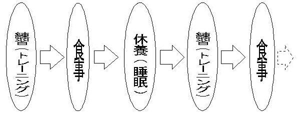 これは練習の効果を最高に引き出すための「生活のサイクル(リズム)」です。この生活のリズムを作ろうとするのが合宿です。つまり短期間に,ひとまわりレベルアップした自分をつくろうというのが合宿です。したがって今回の合宿では,「しっかり練習して,しっかり食べて,しっかり休み(睡眠)をとる自分」をめざしてください。