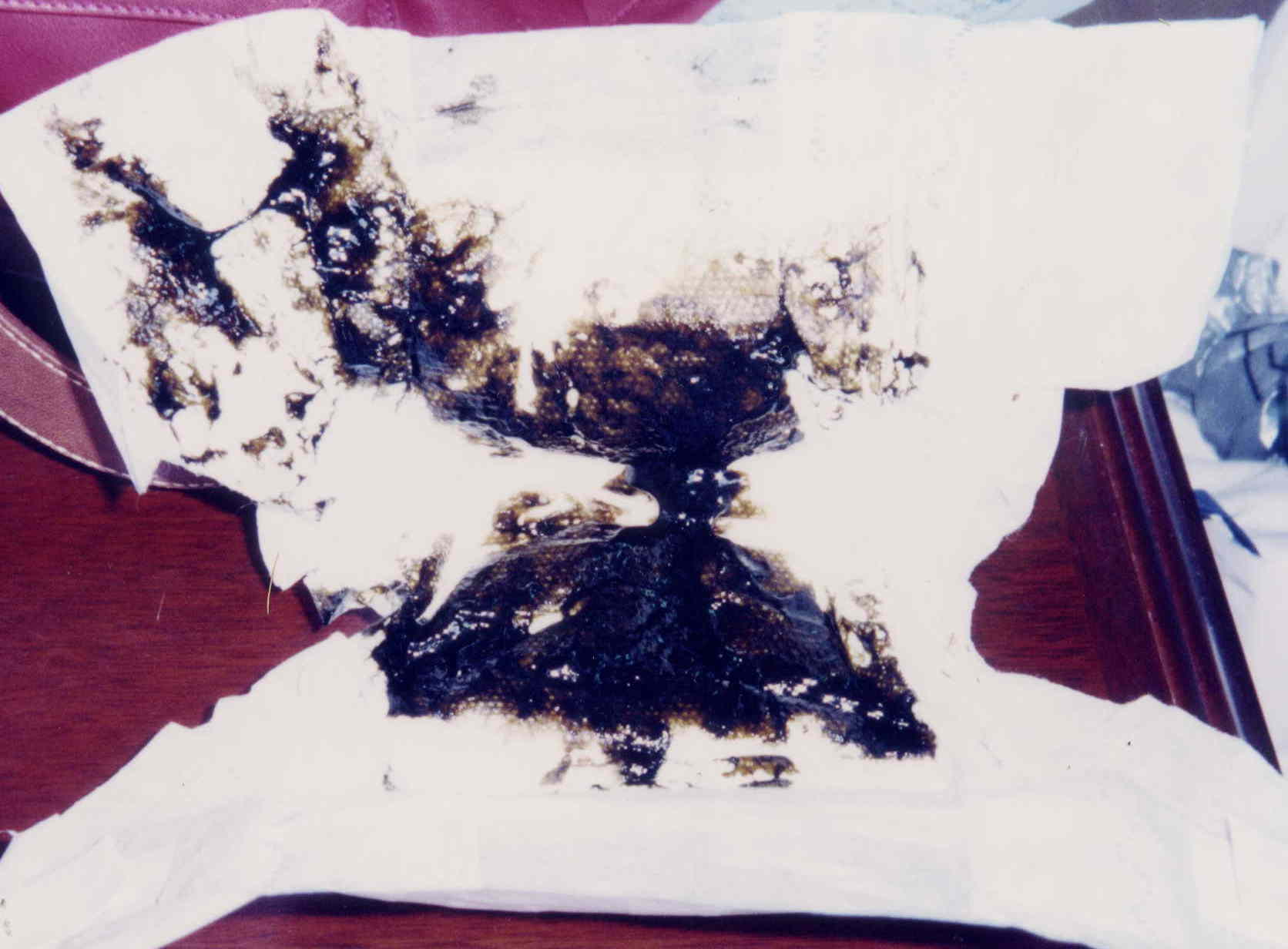 この「胎便」は,私の子どもが出してくれた物です。生まれる前に看護婦さんに頼んでおいて,とっておいてもらいました。(ちょっとかわった人と思われたかも知れませんね。)