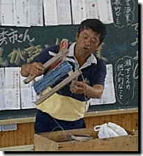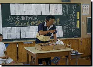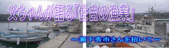 先週の月曜日,瀬下秀市さんをお招きして,五・六年生合同の「とびうお」(総合的な学習の時間)の授業を行いました。題して,「父ちゃんが語る,住吉の漁業」です。