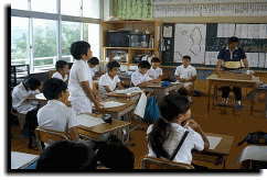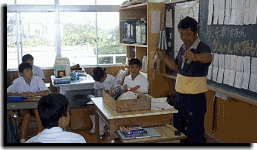 今年の「とびうお」は,これまでもご紹介しましたように,〈わたしたちのすむ町,すみよし〉をテーマに,いくつかのグループに分かれて調べ学習に取り組んでいます。今回の授業は,その中のテーマの一つである「住吉の漁業」。Mさん・Dさんグループは,初め「住吉の産業」ということで調べ学習をスタートさせたのですが,途中で軌道修正し漁業に絞ることにしました。瀬下さんの話は,住吉という地域を知る上で,きっとカギになってくるものと考え,全員による特別授業として位置づけました。